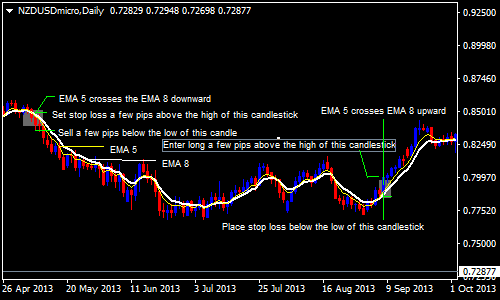 This strategy is basic. It uses 5 EMA and 8 EMA indicators. The principle of this strategy is when the 5 EMA will cross upward the 8 EMA, then the direction of the trend is an uptrend. The trend is a downtrend when the 5 EMA crosses downward the 8 EMA. This system uses a 4-hour and daily timeframe. This is applicable to any currency pairs.