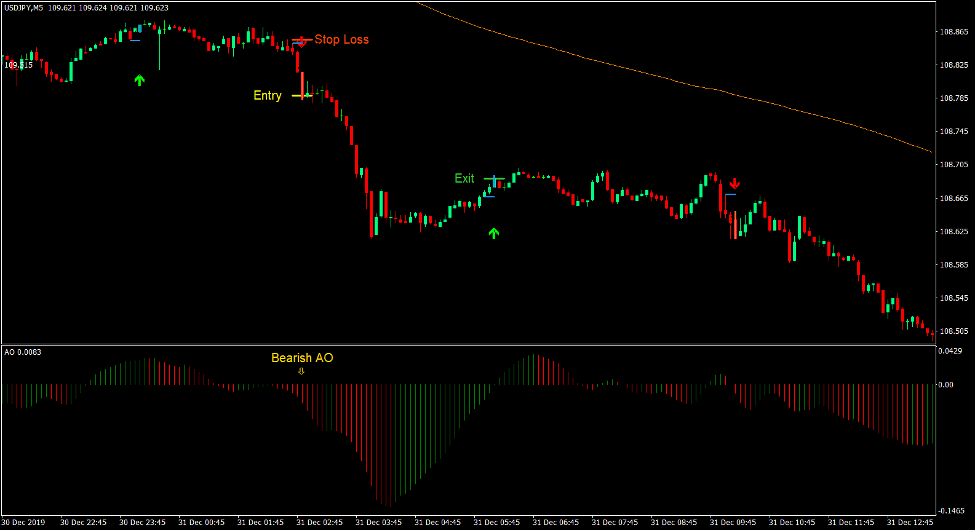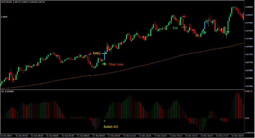 The AO is technically a momentum oscillator which is based on the crossing over of an underlying pair of moving averages. It computes for the difference between a 5-period Simple Moving Average (SMA) and a 34-period (Simple Moving Average). However, instead of calculating based on the usual close of each candle, AO computes its underlying SMA lines based on the median of each candle.