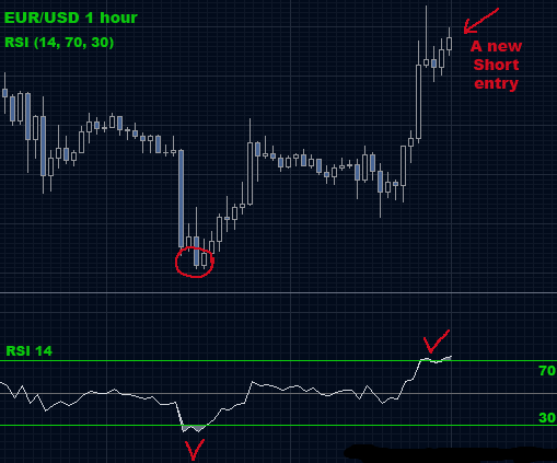 Open a sell position when RSI cross above 70, formed a peak and cross back down through 70.