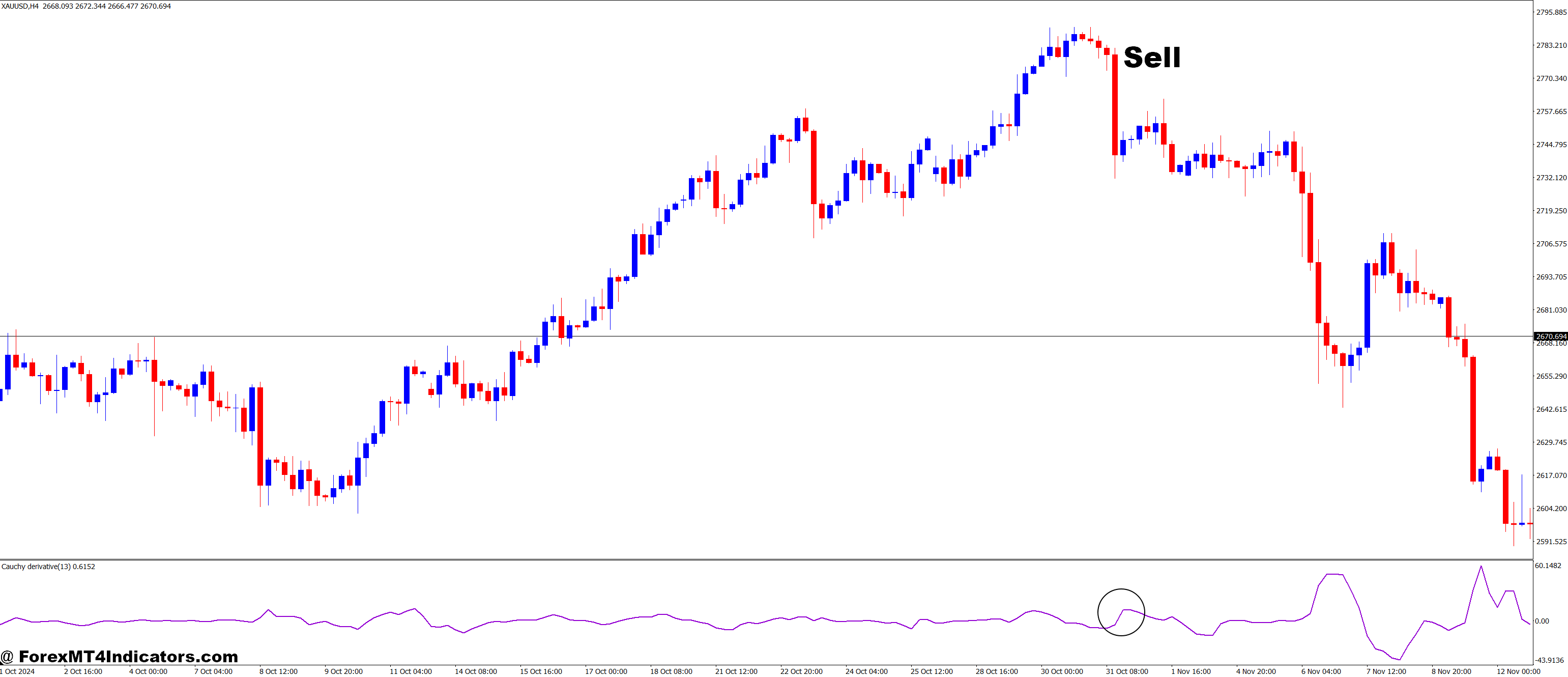 - Wait for the Cauchy Derivative line to turn downward, showing falling momentum.