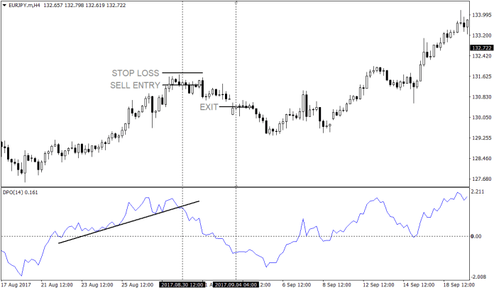 - As soon as the DPO indicator breaks below the support trendline, the trade is entered on the next candle.