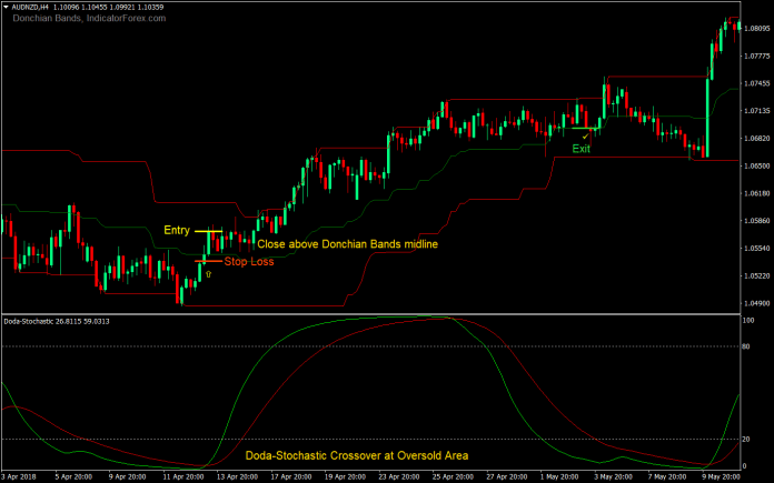 - Don’t take trades where the Donchian Bands’ midline cross is far from the Doda-Stochastic lines crossover