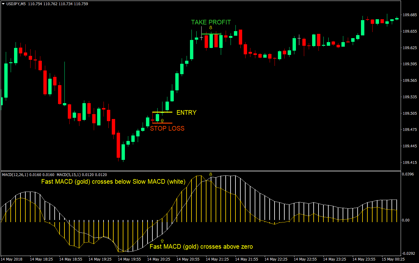 - Close the trade as soon as the gold MACD crosses above the white MACD