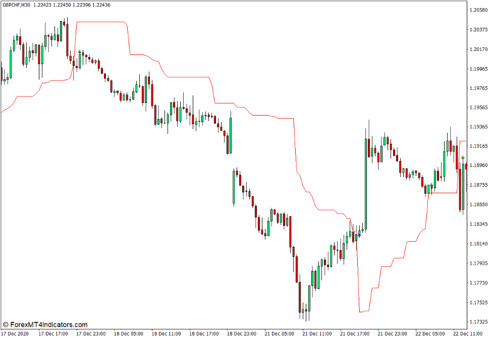 This indicator plots a line on the price chart which follows price action at a distance opposite the direction of the trend. The line plots below price action to indicate a bullish trend and above price action to indicate a bearish trend.