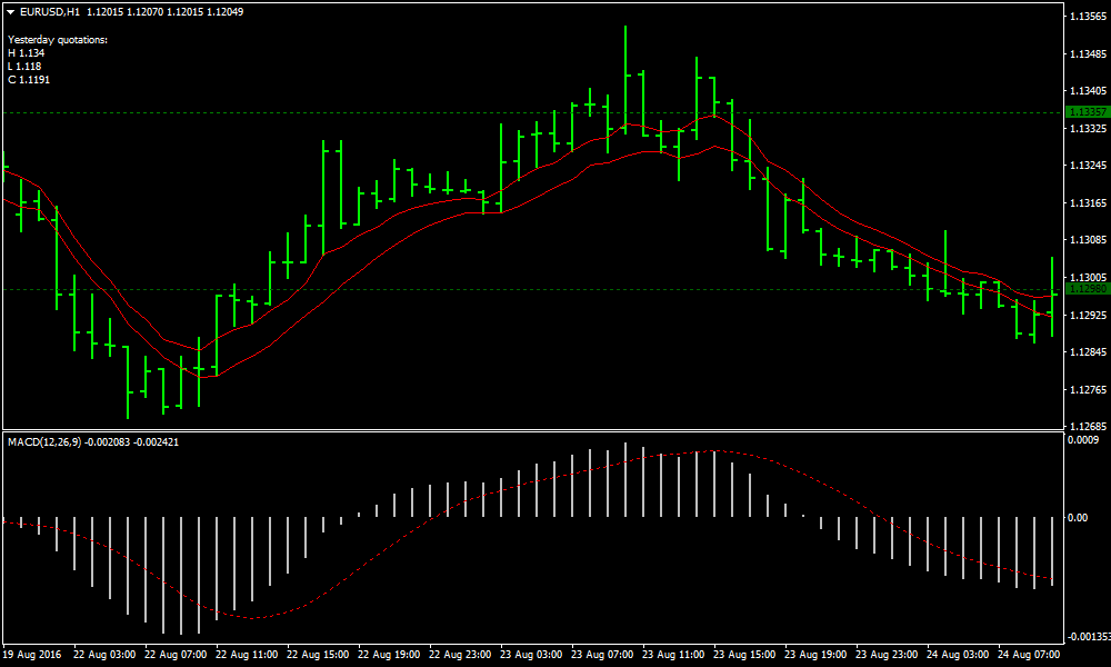 - The price is less than EMA channel and line of the MACD is greater than the histogram.