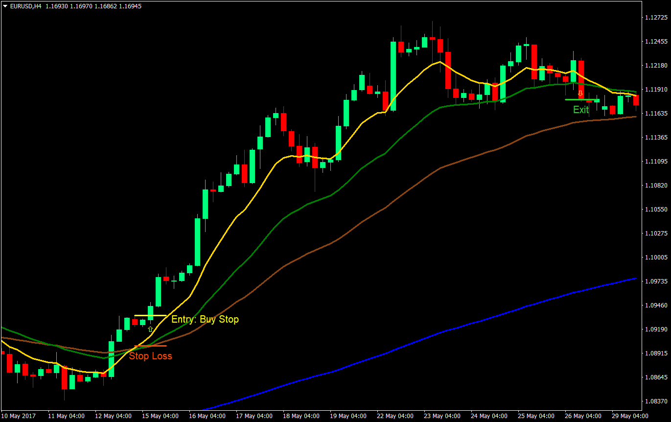 - At the close of the candle corresponding the crossover enter a pending buy stop order at the high of the crossover candle and wait until order is hit