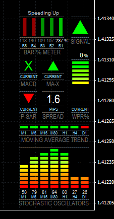 The FX Multi-Meter Indicator is a technical trading tool which is both an information board regarding various indicator directions and a direction signal indicator.