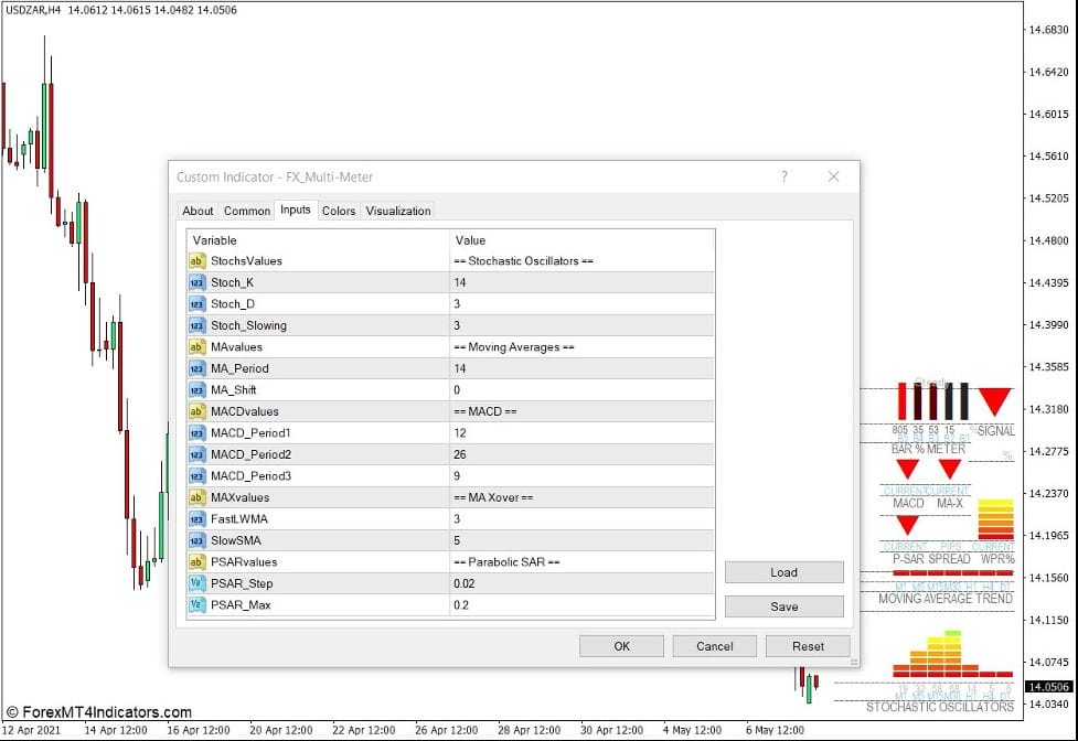 The FX Multi-Meter Indicator allows users to modify the variable inputs of its underlying technical indicators within its indicator settings.