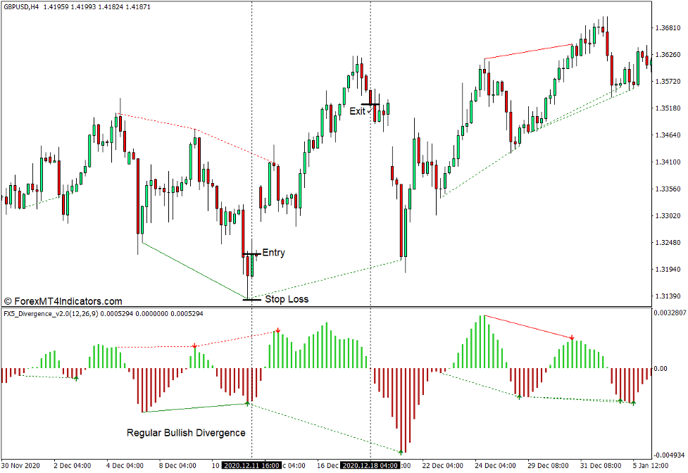 Open a buy order if the FX5 Divergence V2.0 Indicator identifies a valid bullish divergence.