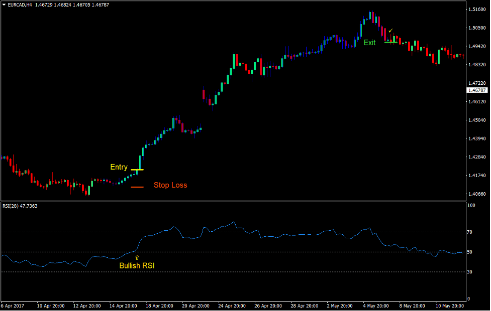 On the RSI indicator, trend reversals will be considered as a possible entry if the RSI line crosses over 50.