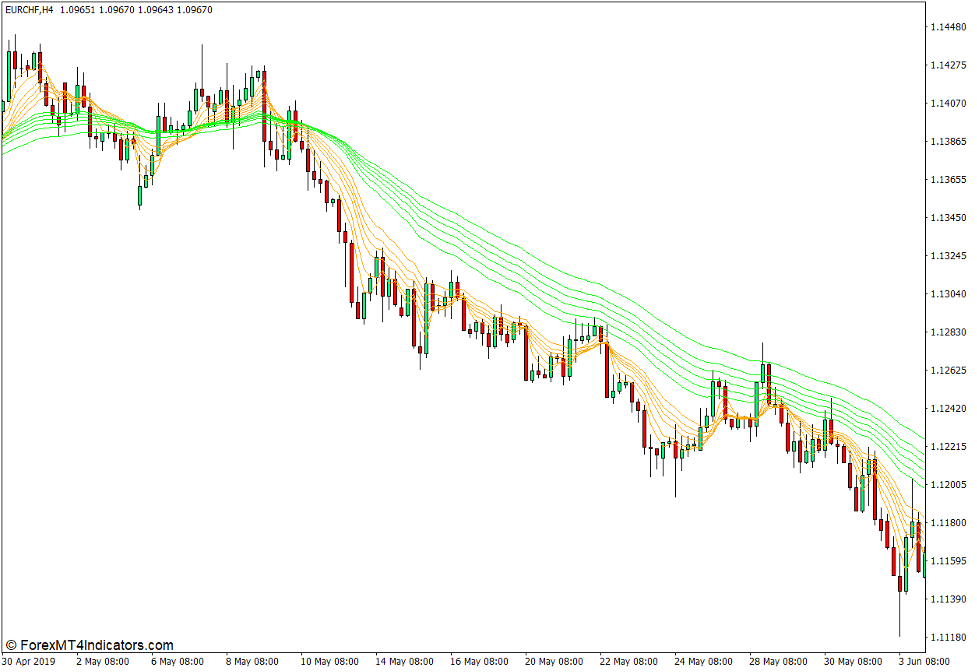 This indicator is composed of two sets of moving average lines, one set represents the shorter trend while the other set represents the longer trend. Each set is composed of six moving average lines. The Guppy Short Indicator is composed of the 3, 5, 8, 10, 12, and 15 period Exponential Moving Average (EMA) lines. The Guppy Long Indicator is composed of the 30, 35, 40, 45, 50, and 60 period EMA lines.