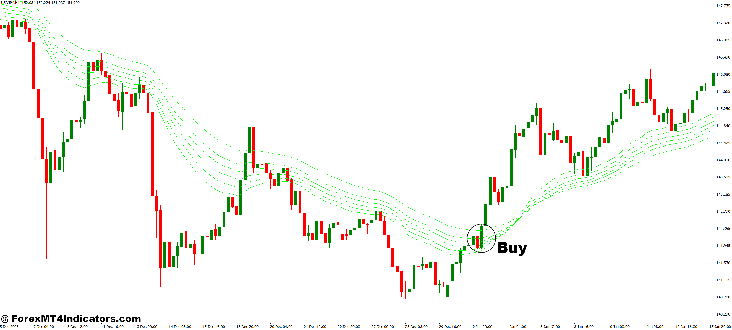 - Wait for the short-term EMAs (typically 3–15 periods) to cross above the long-term EMAs (usually 30–60 periods).