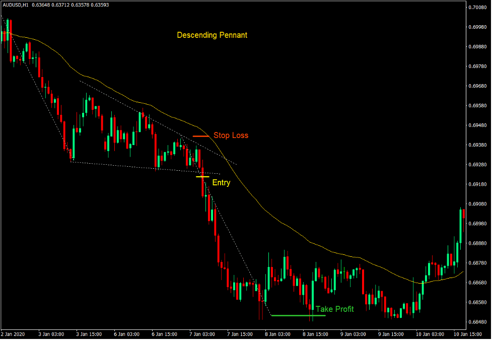 Traders typically wait for the breakout and place their stop losses on the opposite end of the range or the tightening market contraction. The advantage of the flag pattern is that it has more room for price to move since the stop loss would be a bit further. On the other hand, pennants could also be good because the contracting pattern allows for a tighter stop loss allowing for higher risk-reward ratios.