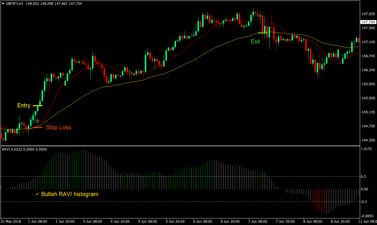 Lastly, we will be adding another filter to this crossover strategy. We will be using the RAVi custom indicator. It is an oscillating type of indicator that prints histogram bars around the midlevel zero. However, it has marks on level +/- 0.3. These levels determine if the market has tendencies to be bullish or bearish. The indicator also changes color indicating the direction of the trend. Green bars indicate bullish trending tendencies while red bars indicate bearish trending tendencies. Gray bars are printed if the RAVI histogram either hasn’t crossed the +/- 0.3 level yet or is closer to zero than the previous histogram bar.