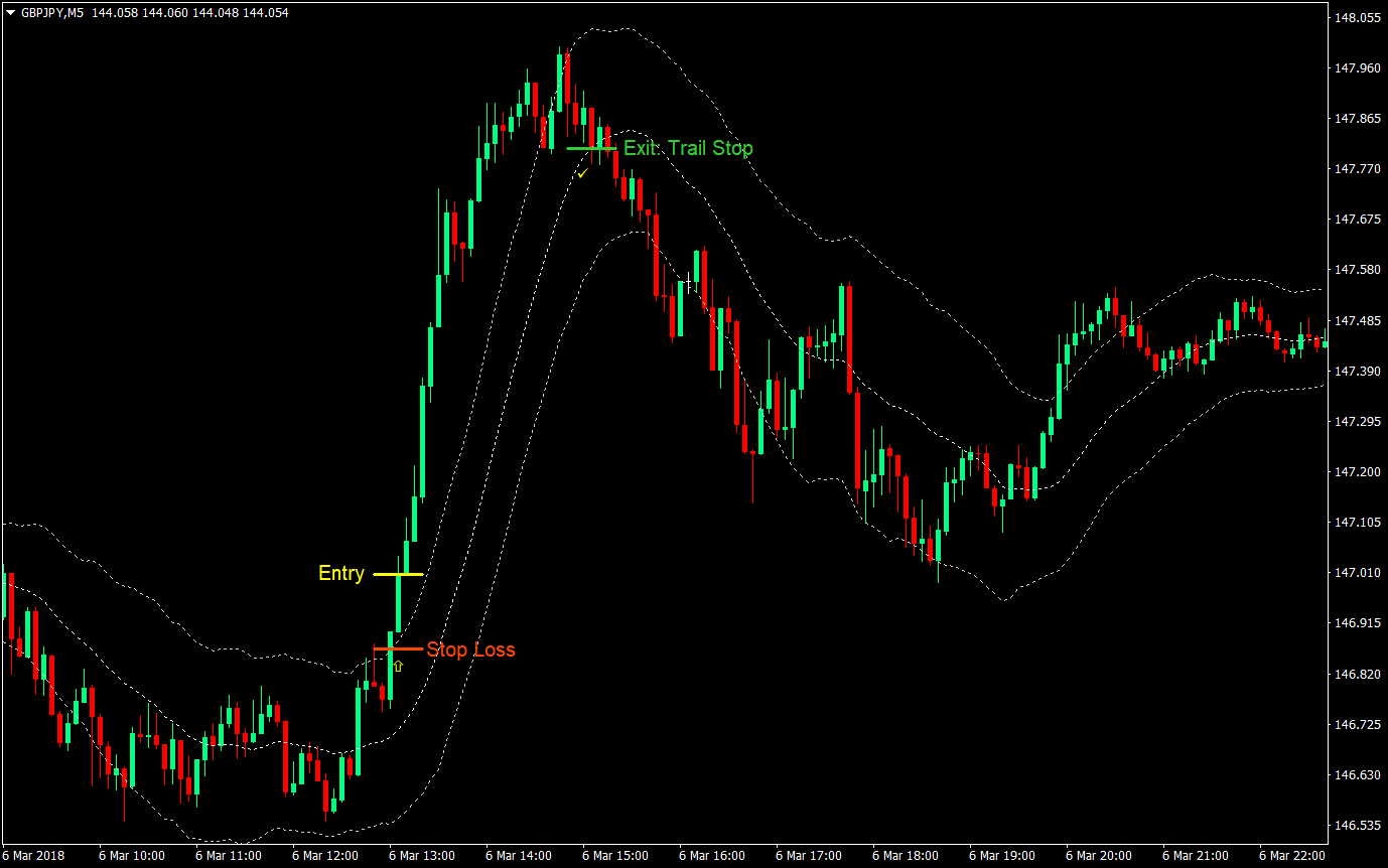 The key to this strategy is identifying the right momentum candle breakout. You shouldn’t be trading just a small pierce of the outer bands as this might still bounce off.