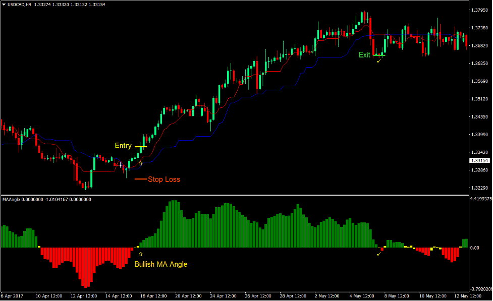 • Close the trade as soon as the MA Angle indicator bar changes to yellow or crosses below zero.