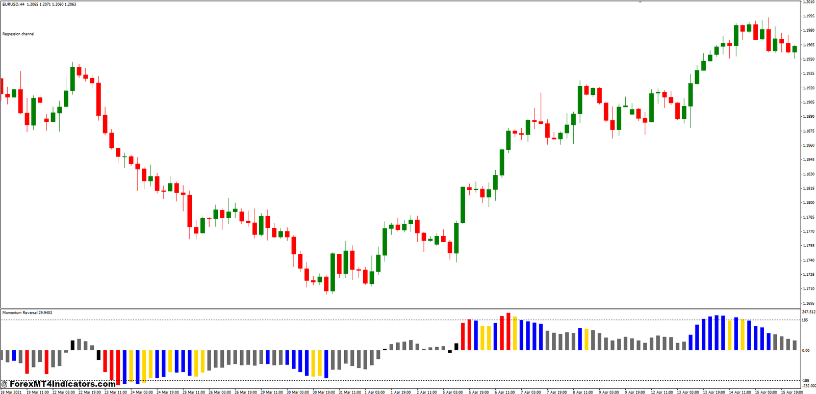 The Momentum Reversal Detector is a powerful complement to the Linear Regression Channel in the forex trading strategy. This indicator focuses on analyzing changes in the momentum of price movements. By measuring the rate of acceleration or deceleration in price changes, the Momentum Reversal Detector identifies points where the market’s momentum is shifting, which can signal potential reversals. It provides traders with early warnings about changes in the market dynamics, allowing them to adjust their strategies before the broader market responds.