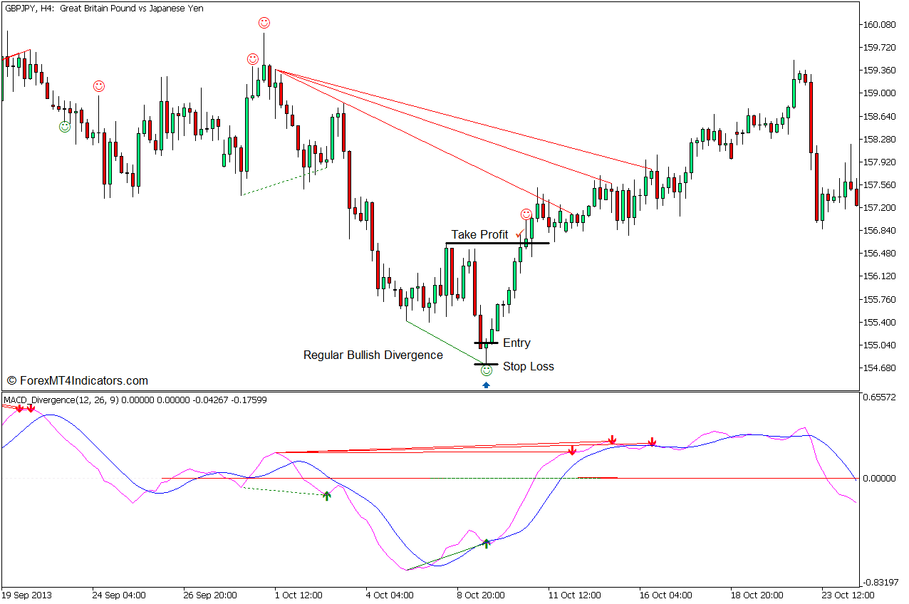 - The MACD Divergence indicator should identify a bullish divergence pattern and plot a line below the price action and the MACD line.
