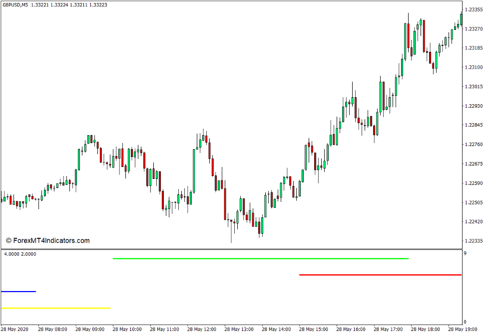 Market Hours indicator is a custom technical indicator which provides traders the information regarding what market sessions are currently open based on the current time. This information is displayed directly on the MT4 platform on its own indicator window. This indicator plots lines on its own window which has different colors. Each line color represents a market session.