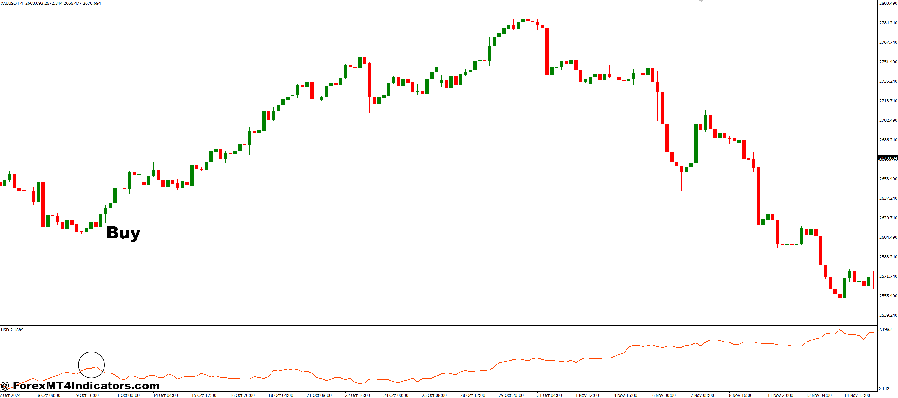 - Enter a buy trade once the MIndex begins rising from the oversold area.