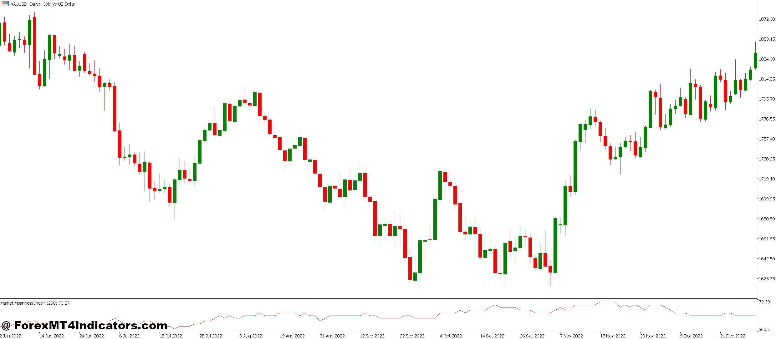 - The MMI MT5 Indicator shows a strong downward trend (e.g., red or downward arrows/signals).