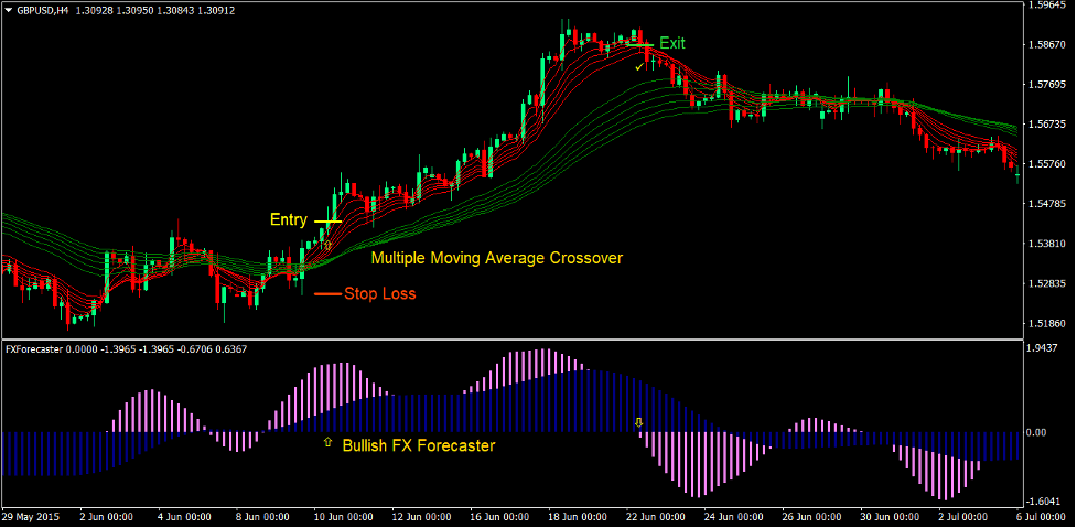 To trade this strategy, traders must look for confluences of trend reversal signals indicated by the Guppy Multiple Moving Average and the FX Forecaster indicator.