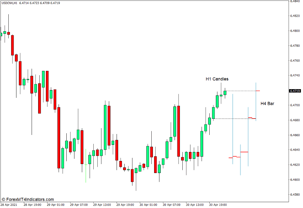 On the other hand, using the MTF Candles on a lower timeframe allows users to see what the price action is on the lower timeframe. For example, using the H4 MTF Candles on the 1 hour timeframe would allow users to see the bigger picture price action based on the 4-hour timeframe.