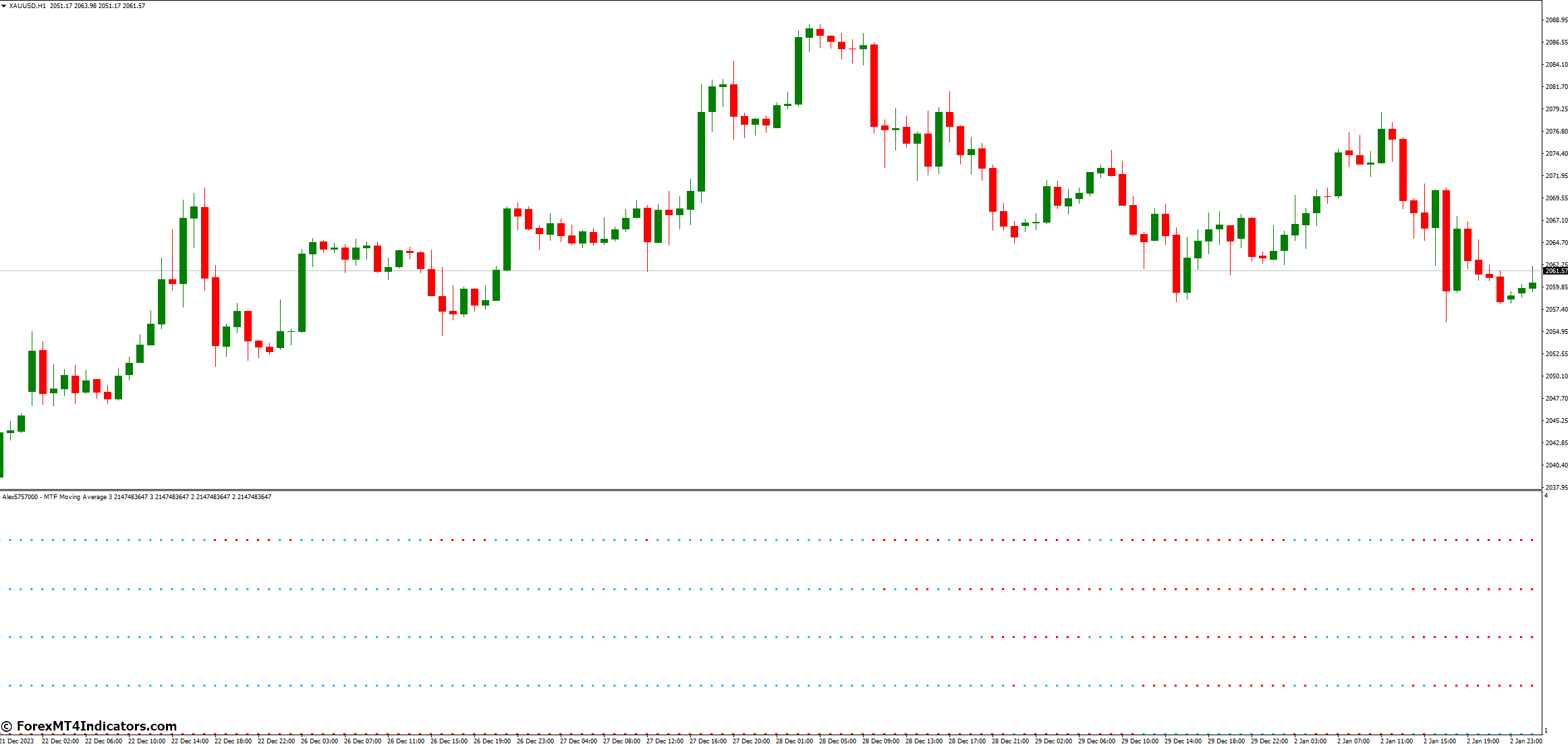 Using the Multi Moving Average V2 Indicator is straightforward. Once installed, the indicator generates trend-following buy-sell signals that you can use to make informed trading decisions. The indicator uses blue and red dots to represent these signals. A blue dot is a buy signal, indicating that the market trend is upward. Conversely, a red dot is a sell signal, suggesting a downward market trend.