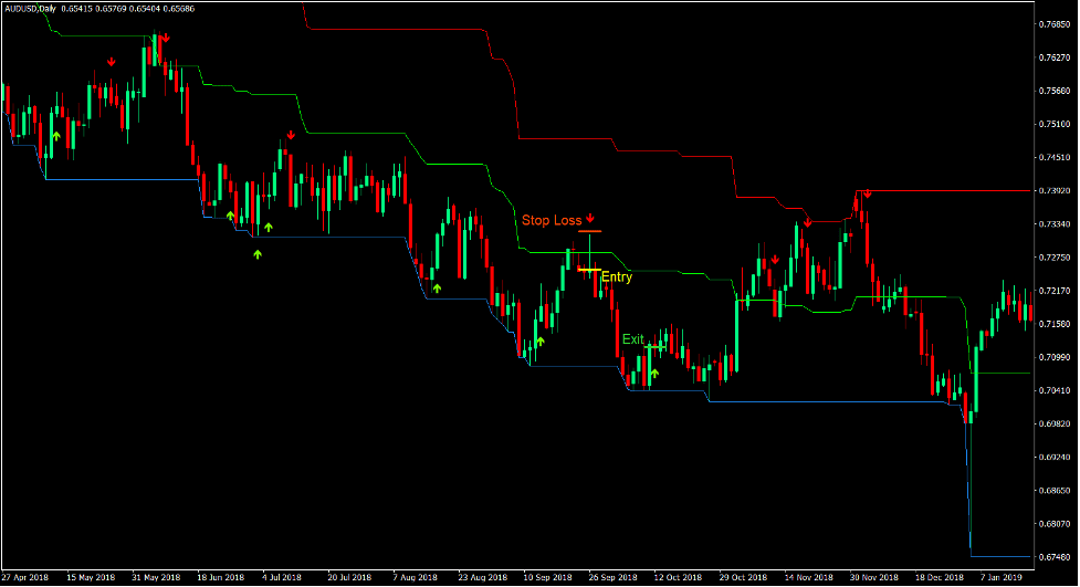 This indicator can be used to identify trend direction. This is simply based on which half of the channel price action is generally staying. If price action is usually on the upper half, then the trend is bullish. On the other hand, if price action is usually on the lower half of the channel, then the trend is bearish. If price action tends to whipsaw the middle line, then the market is not trending.