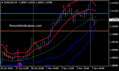 - The price must go in the buy zone or breaks the lower band. There must be a pin bar represented by a small green arrow.