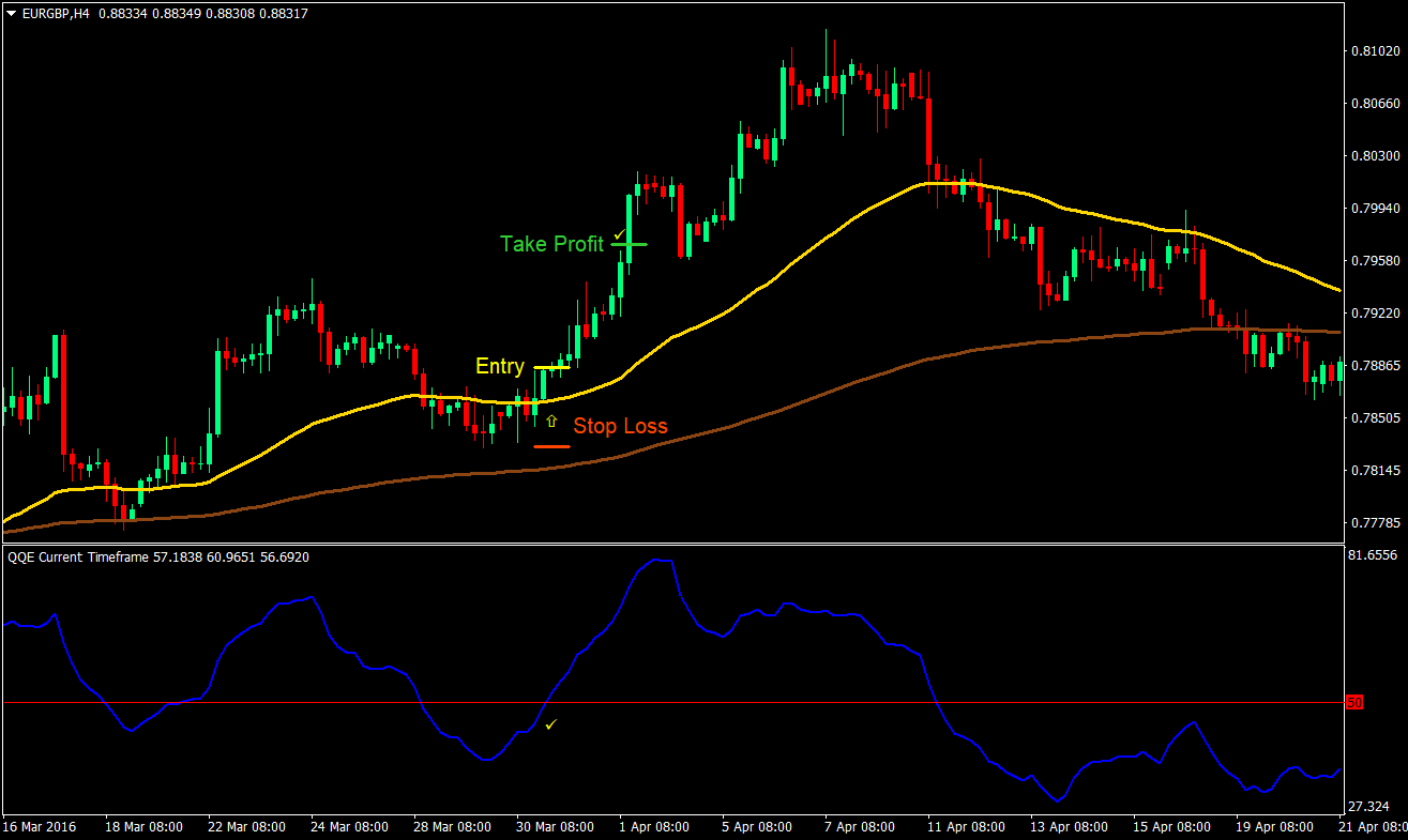 Lastly, as for our trigger, we would be using the QQE indicator. Whenever price retraces back to the 50 EMA, the QQE typically crosses back to its midline. We will then wait for the QQE to cross over the midline once again signifying a resumption of the trend.