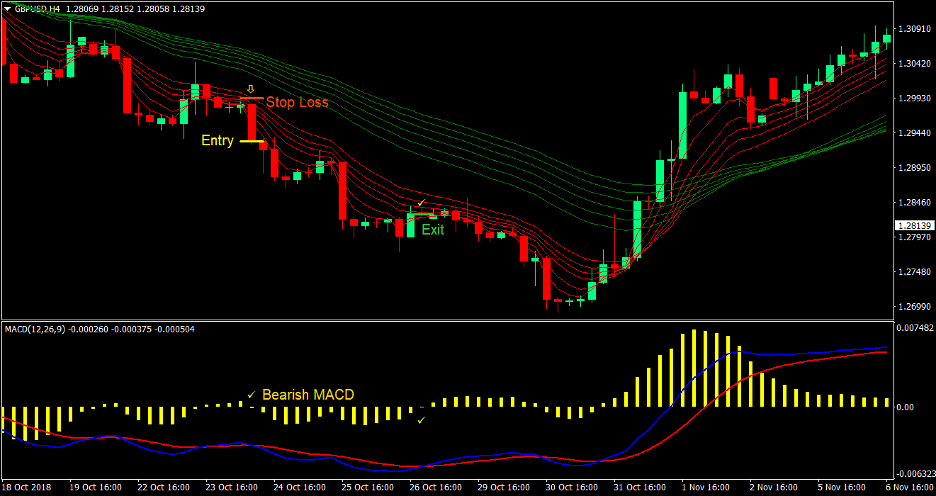 • The red set of multiple moving averages should be below the green set indicating a bearish long-term trend
