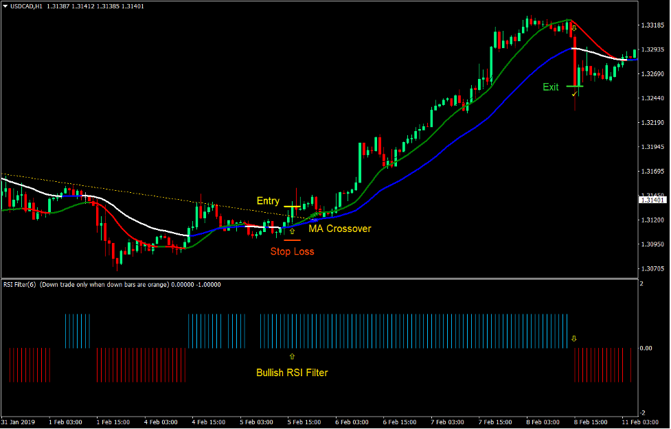 - The Flat Trend RSI filter should be printing positive histogram bars indicating bullish momentum.