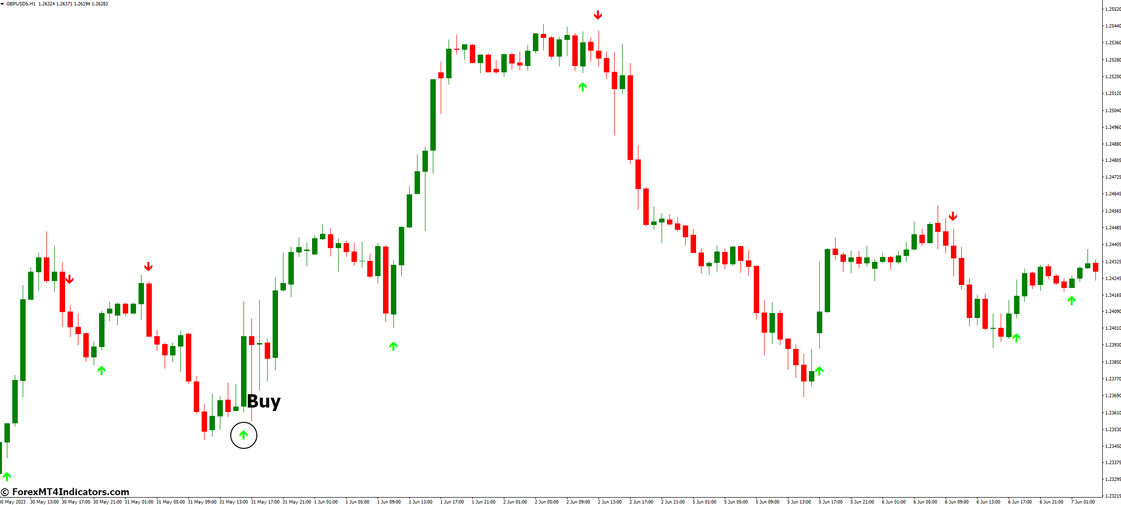 The indicator provides signals for forex trading using arrows. A downward arrow points to a potential selling opportunity, and an upward arrow points to a prospective buying opportunity. Both novice and experienced traders will find it simple to comprehend the signals thanks to this graphic depiction.
