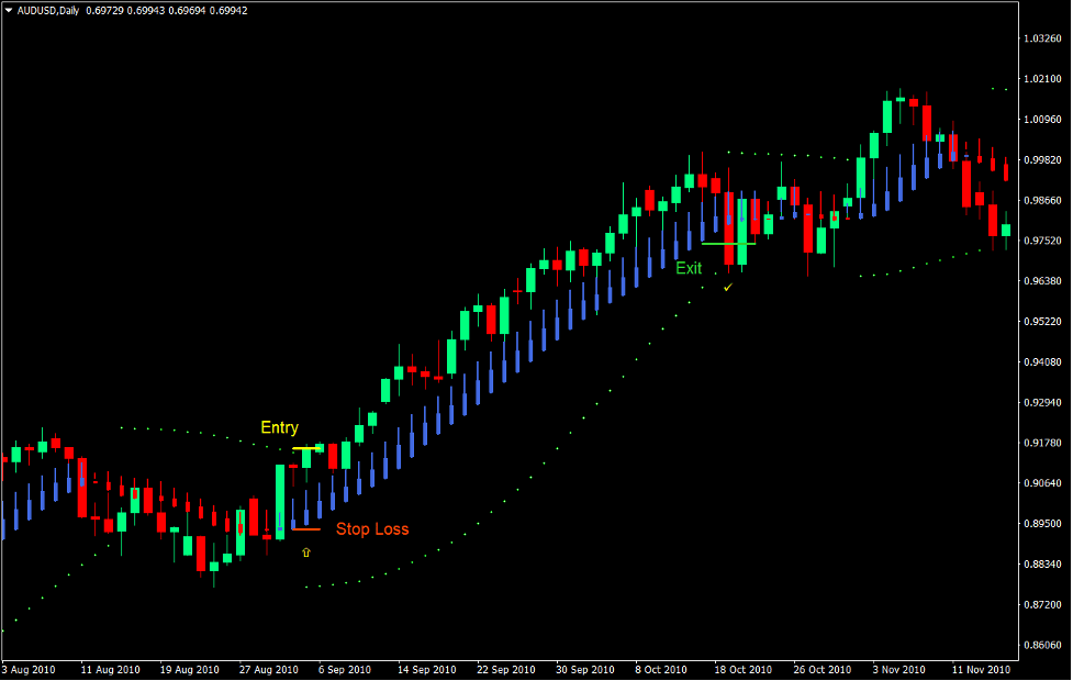 The Parabolic SAR assumes that a trader is always invested in the market, thus the name “Stop and Reverse”. Traders simply enter the market to the opposite direction as the market reverses. This sounds good in theory. However, it does not always work. This would work well in trending markets, but it would cause significant losses when used in a choppy market. The developer of the indicator advices to use this indicator in confluence with other indicators that help identify trend direction. It would also benefit from candlestick patterns that could indicate a trend reversal.