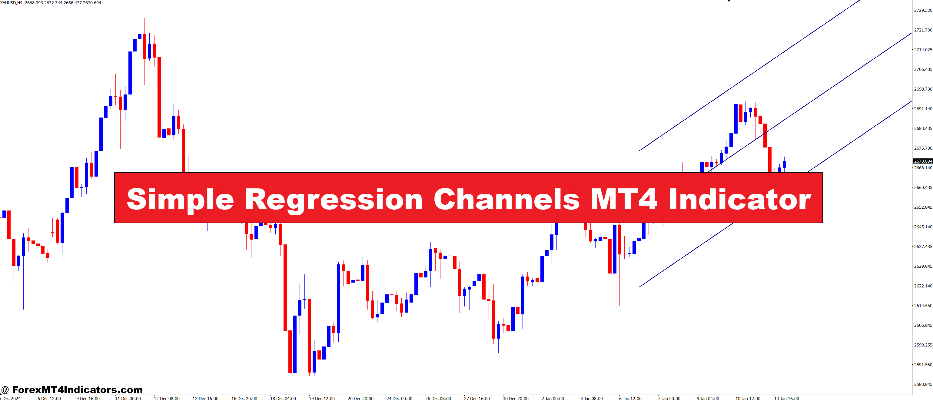 The Simple Regression Channels MT4 Indicator is a technical analysis tool designed to help traders visualize the direction and strength of a market trend. It plots a central regression line based on recent price data, along with two parallel lines above and below it. These lines create a channel that shows where the price is likely to move, bounce, or reverse. It’s especially helpful for traders who want a quick view of the market’s movement without adding too many complicated tools to their charts.