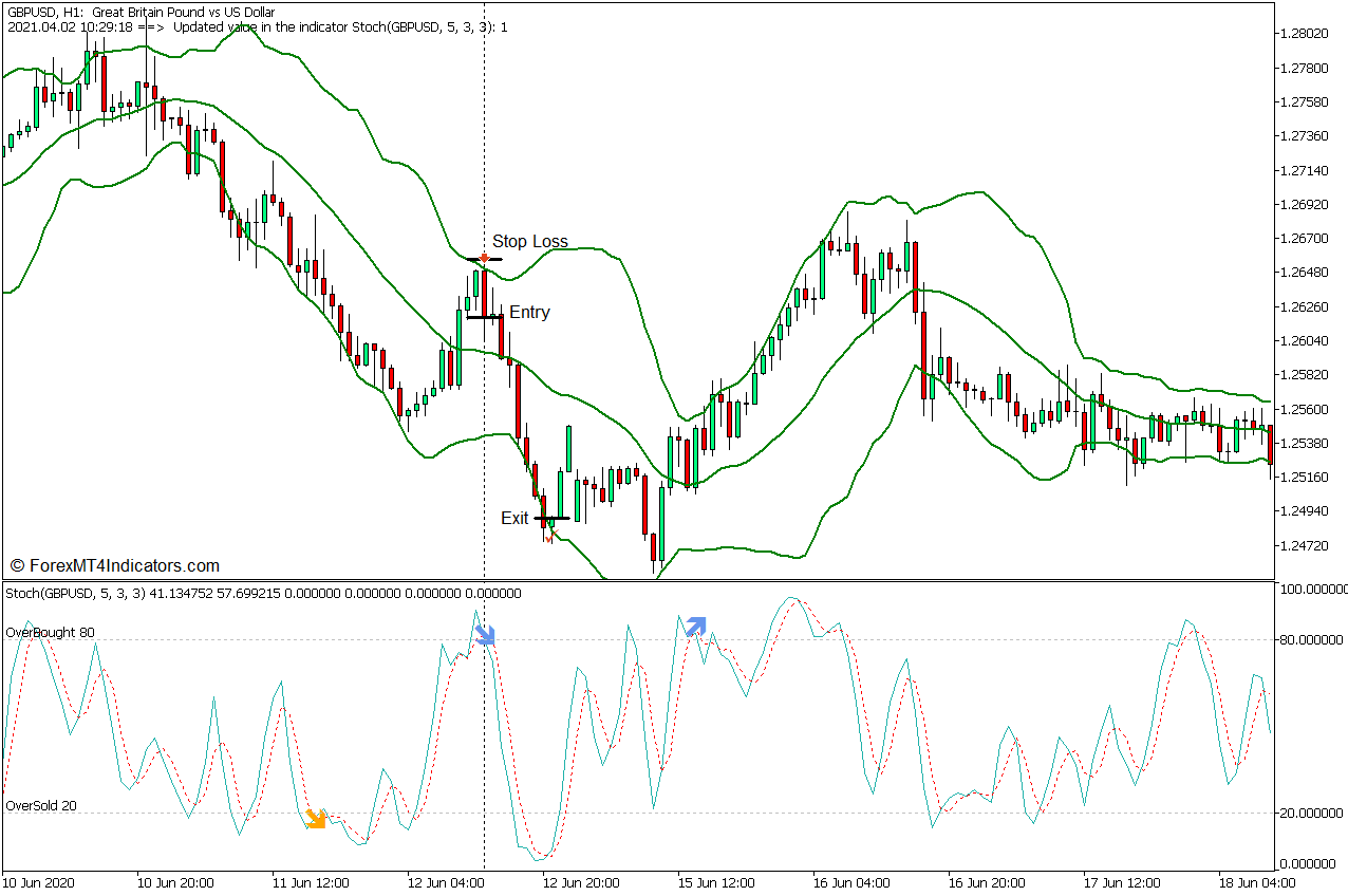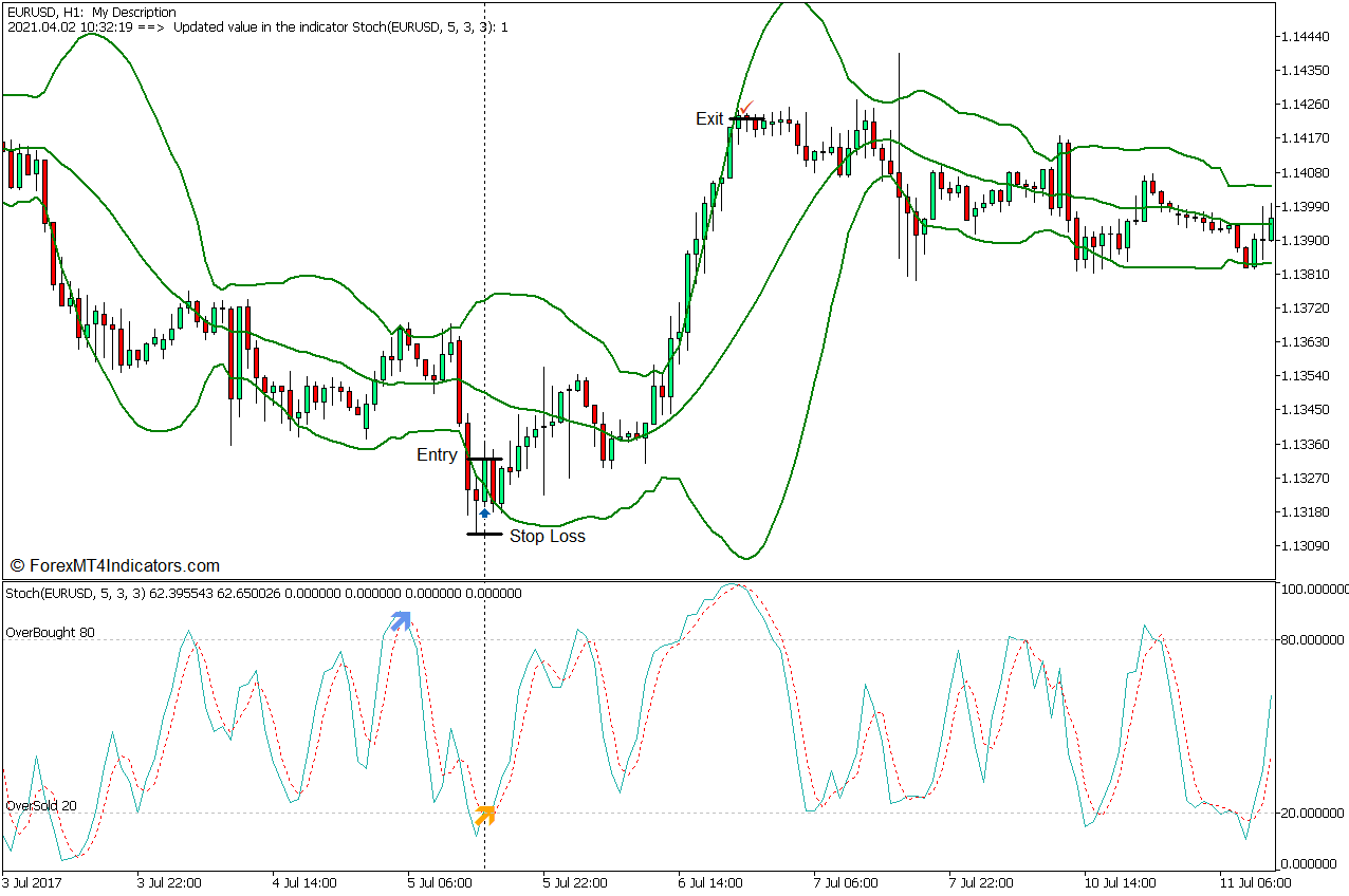 The Stochastic Oscillator component of the Engulfing Stochastics would be used to observe overbought and oversold price levels based on the lines breaching the 30 to 70 range. The Engulfing Stochastics signals is then used to confirm the mean reversals from the Bollinger Bands outer lines.