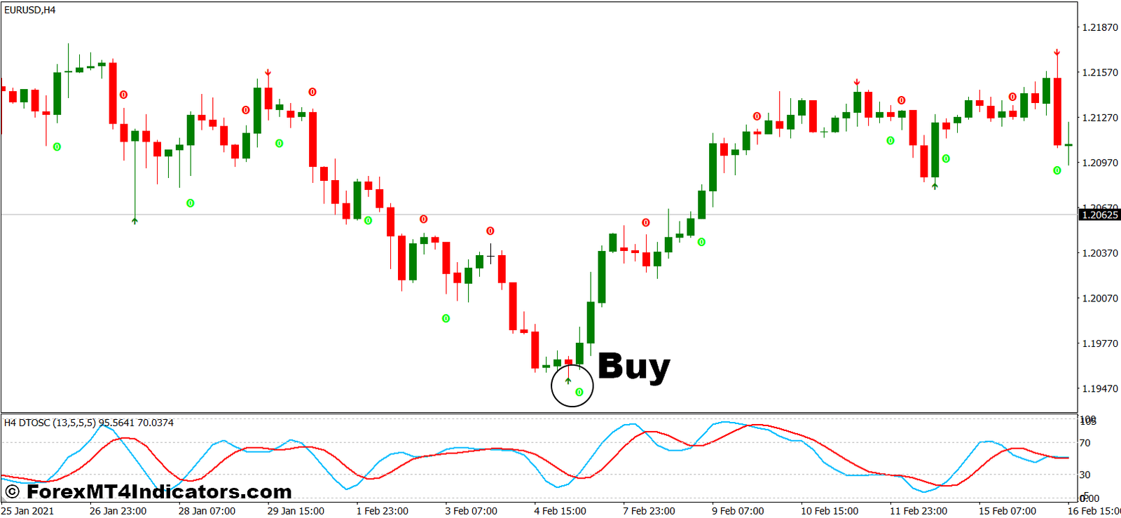 - Verify the bullish signal with confirmation from the DTOSC Indicator. Ensure that DTOSC shows the market in oversold territory or is crossing above the oversold threshold, indicating favorable buying conditions.