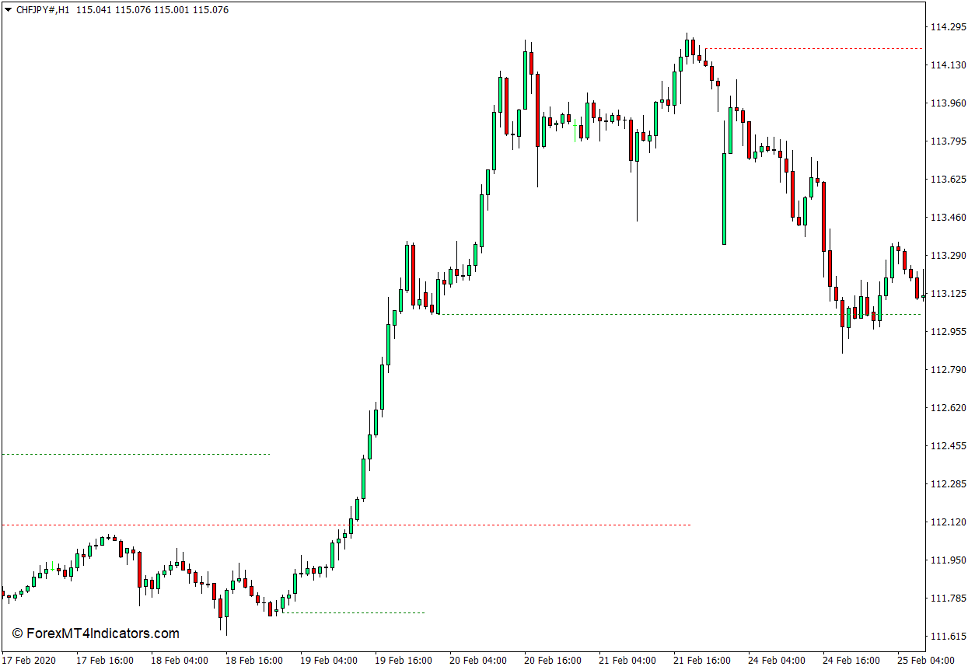 This peculiarity allows the indicator to plot a horizontal support or resistance level which is not at the exact peak or bottom of the swing high or swing low.
