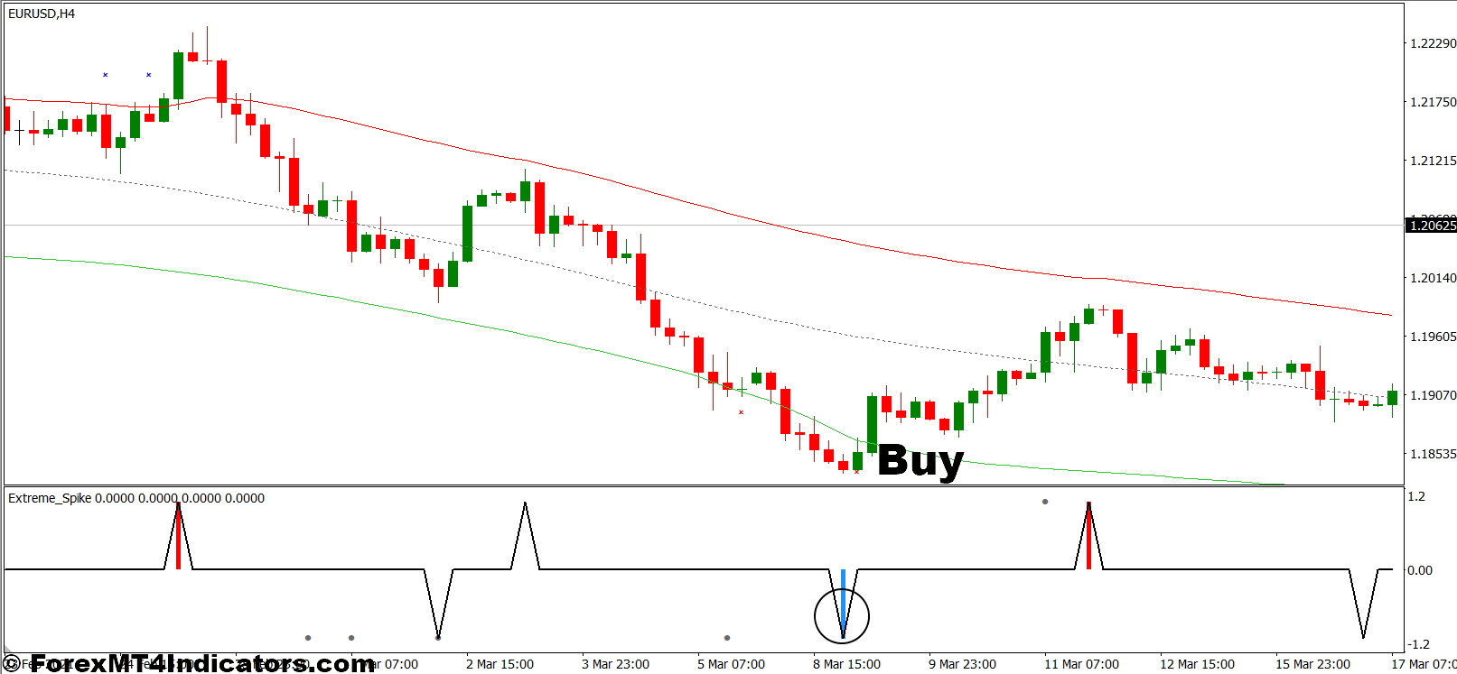 - Enter a buy trade as soon as the price closes above the upper TMA band after the spike.