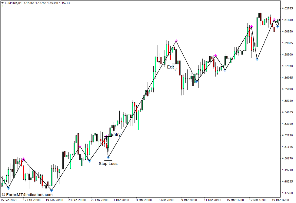 The Trend Signal Version 2 Indicator uses a complex algorithm which allows it to detect potential trend reversals. Based on its code, the indicator compares price movements with the average range of the candles. The indicator then plots an arrow whenever it detects a trend reversal pointing the direction of the new trend. It then connects the point where the arrow is placed to the point where the previous arrow is. This forms a zigzag like pattern which is quite different from the classic Zigzag Indicator.