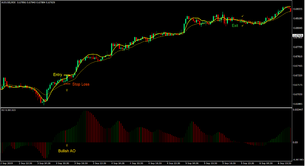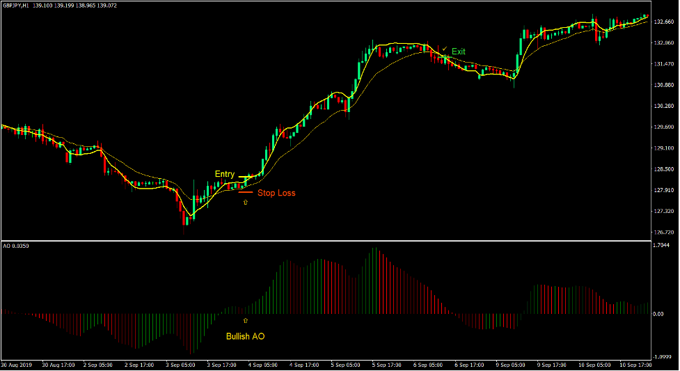 The Awesome Oscillator is used to confirm the new trend and the direction of the momentum. Traders should only take buy trade setups whenever there is a positive green bar on the AO and sell trade setups only when the AO has a negative red bar.