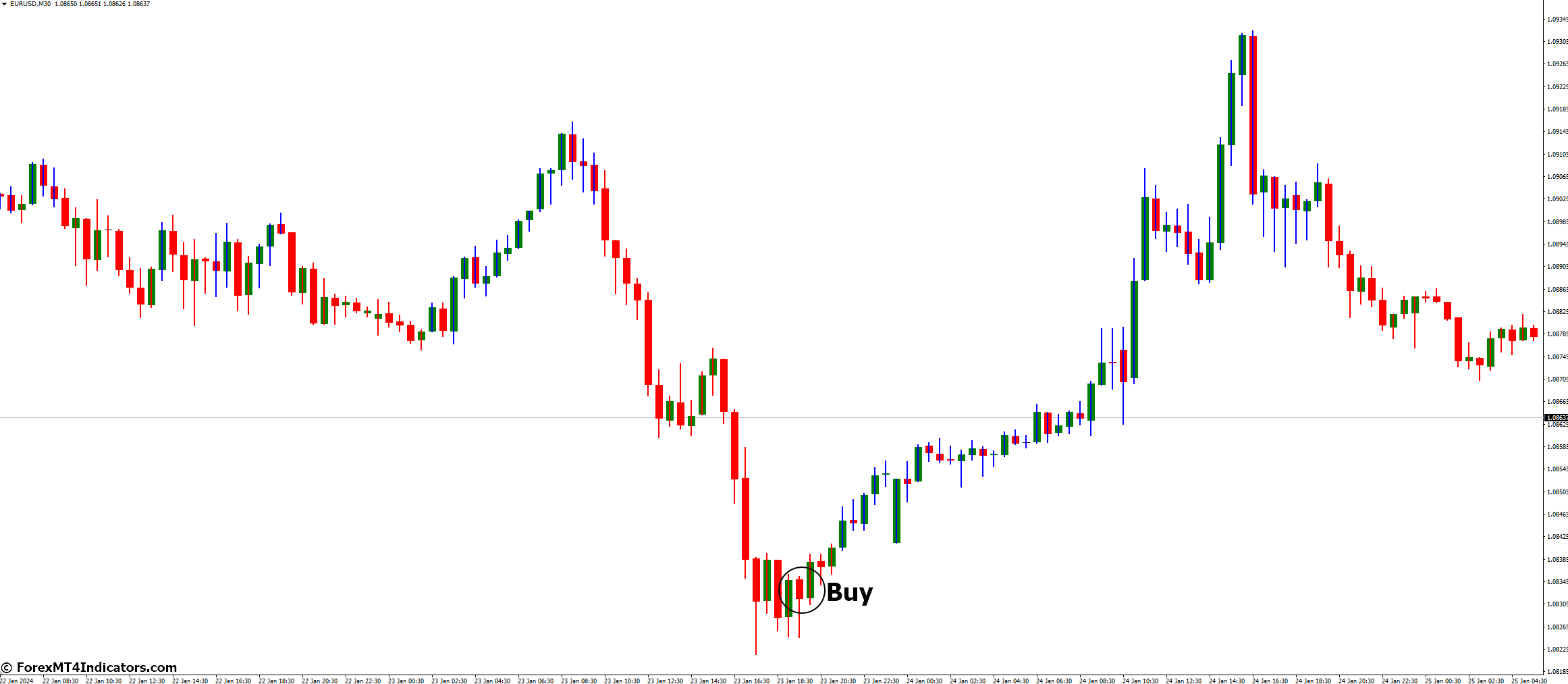 - Look for a bullish candlestick pattern with a blue color.