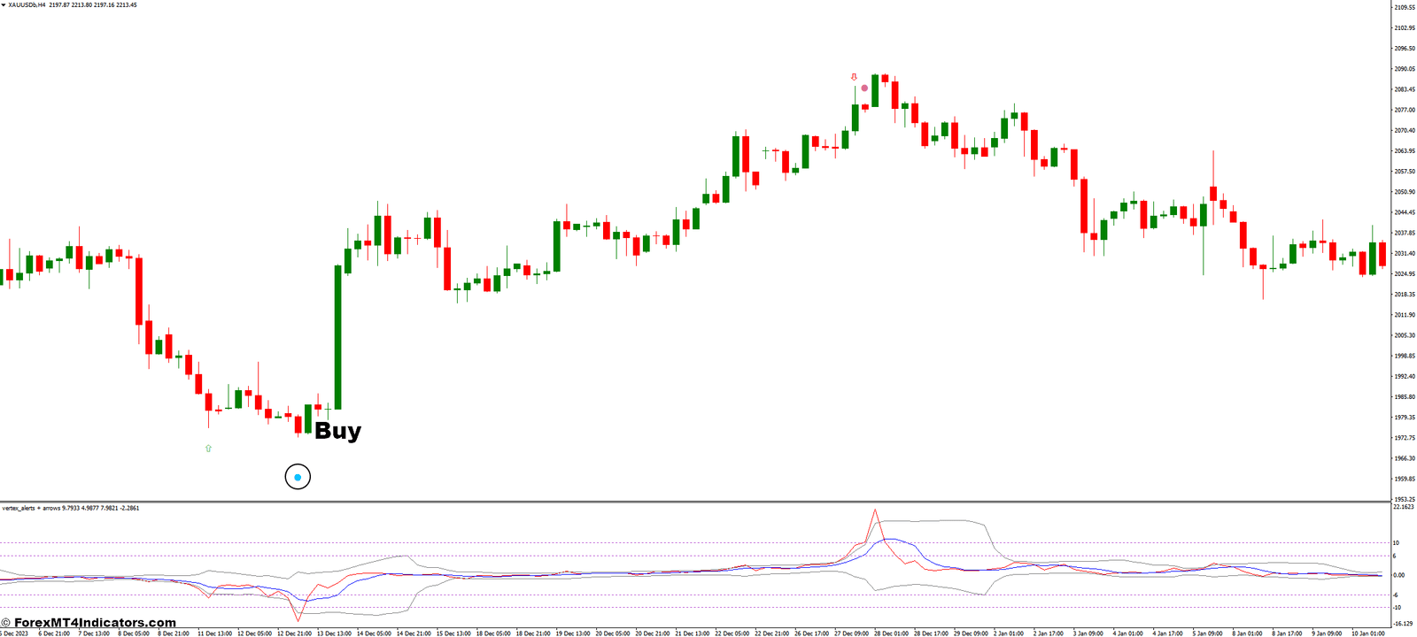 - Look for a green arrow appearing on the price chart, ideally following a period where the price dipped into the oversold zone on the Vertex oscillator (if visible).
