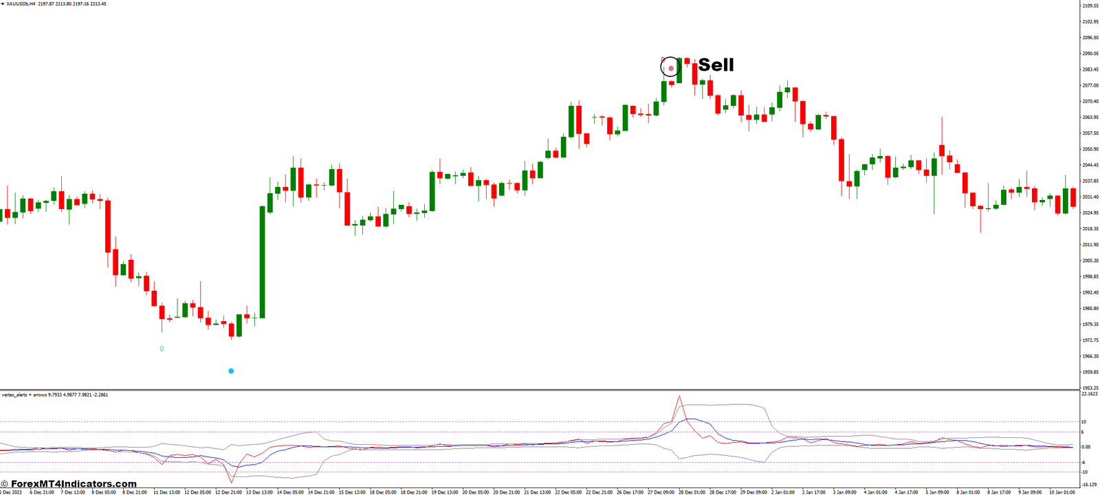 - Look for a red arrow appearing on the price chart, ideally following a period where the price reached the overbought zone on the Vertex oscillator (if visible).