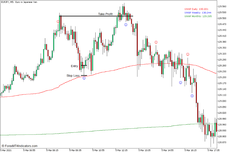 Trades are taken as soon as price action shows signs of price rejection at the level of a VWAP line right after the strong pull back. The price rejection is then confirmed by the pin bar signal using the Pin Bar Detector Indicator.